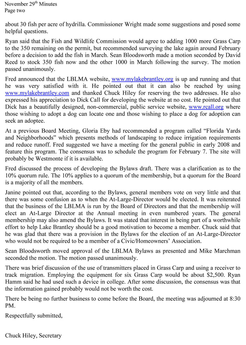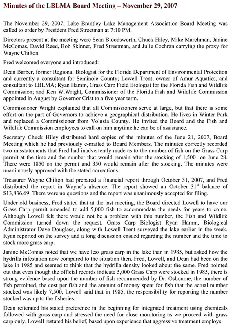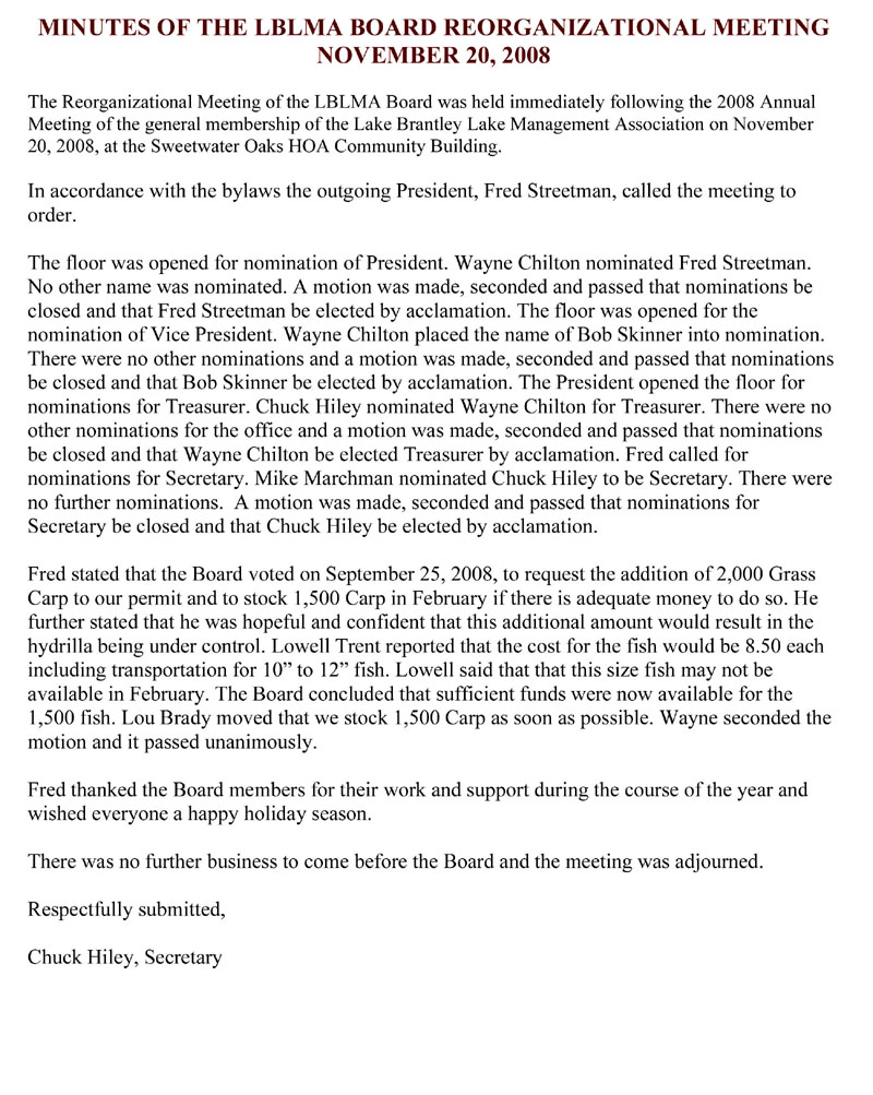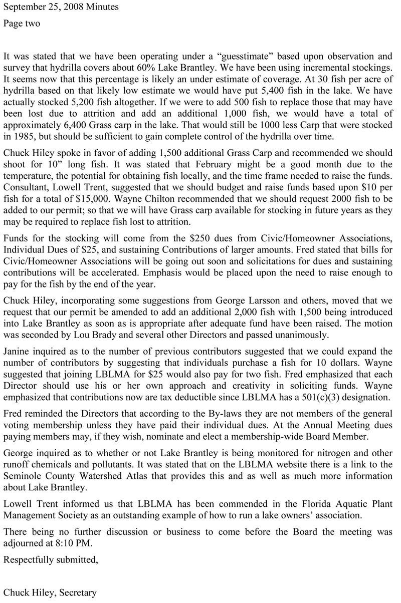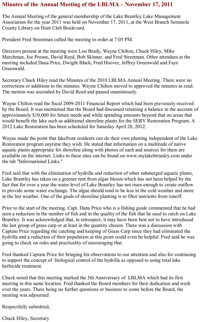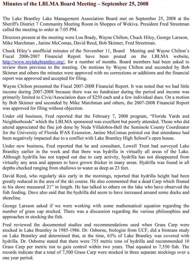 Minutes of the LBLMA Board Meeting - June 21, 2007 President Fred Streetman called this meeting of the LBLMA Board to order at 7:11 PM. Fred introduced Mike Marchman who is an original Board member, but whose wife substituted for him at the first Board meeting in October. Lou Pesce was introduced as a proxy for Janine McComas and Tim Pullar for David Reed. Fred welcomed our newest Board Member, Mel Hamilton representing Brantley Club. Also present on the Board were Fred Streetman, Bob Skinner, Chuck Hiley, Wayne Chilton, and Sean Bloodsworth. Fred recognized Dean Barber former Regional Biologist of the Florida Department of Environmental Protection and currently a consultant to Seminole County; Gloria Eby, Senior Environmental Specialist for the Seminole County Public Works Department's Road Operations/Stormwater Division; and consultant, Lowell Trent owner of Amur Aquatics. Secretary Chuck Hiley, read the minutes of the October 26, 2006 Board meeting after distributing a copy to the Board members. There were no corrections or additions to the minutes and they were unanimously approved as read. Treasurer Wayne Chilton presented the Treasure's Report after distributing copies of the report to the Board. This covered the period from 9/30/2006 to May 31, 2007. Wayne explained the fact that the report consolidated several accounts that had been used during the transition to our current corporation status. The Treasurer's report was accepted unanimously. Fred reiterated that we are now incorporated as a non profit with the State of Florida and in February applied for a 501(c)(3) designation. He said the IRS is several months behind on dealing with such applications. We now have Directors and Officers liability insurance coverage for officers and directors. He called attention to the fact that signs indicating introduction of Grass Carp into Lake Brantley are placed at every boat ramp accessing the lake. A discussion ensued regarding the loss of Grass Carp from predation due mostly to otters and mostly in canals. It was stated that 5 exclusion barriers remain in Lake Brantley and will continue to be monitored to gauge the impact of the Grass Carp. There were comments regarding the need for a previously discussed web page. Chuck and Fred will be conferring regarding its design and development with the goal of having it up and running shortly. Fred commented that a name like, "mylakebrantley.com" would be appropriate and easy to remember. There was a discussion of Lowell Trent's May 17, 2007, report of his visual survey of Lake Brantley. At this time there are 1,850 Carp remaining on our permit. Lowell's report recommended adding 1,000 to 1,800 as soon as possible. There were questions about putting fish in now in the summer heat. Lowell stated that the water was now in the low 80 degrees, which is acceptable, but that by September the temperature would be too high. Questions were raised as to what number of fish would be appropriate. The consensus was that the goal is to be aggressive without excessive removal of native plants. Wayne Chilton moved and it was seconded to stock the lake with 1,000 fish of 8-10 inches in length as soon as possible and put in the remainder later in the fall. Following some discussion, Mel Hamilton moved and it was seconded to amend the motion to state that 1,500 fish would be stocked as soon as possible and to leave 350 remaining on the permit. Bob Skinner called the question. All voted in favor of ending discussion. The amendment passed unanimously and the main motion as amended passed unanimously. Fred said that Bob Skinner would arrange to have the Carp put in at the Jennifer Estates boat ramp. Lowell was asked to get the permit amended to add 5000 fish. Julie Cochran inquired from the audience as to whether there was a "Plan B" in case the Grass Carp did not reduce the hydrilla. The response was that although combining the use of chemicals was always an option there was a high level of confidence by Lowell and others that the Grass Carp would ultimately control the hydrilla in Lake Brantley. Gloria Eby complimented the organization on its professionalism and recommended some programs for future meetings. She announced the Annual Snail Day to be held August 11 to remove Channeled Apple Snails and their eggs from Lake Brantley. She answered question about the detrimental impact of Channeled Apple Snails. There were questions about individuals using chemicals in the lake adjacent to their property. Dean Barber explained that although permits were not required in the canals of less than 10 acres, permits are required to spray in Lake Brantley. He advised individuals to contact Amy Giannatti, Regional Biologist at the Florida Department of Natural Resources. Gloria Eby and Dean Barber referred us to individuals involved with Myrtle Lake to learn about their experience in obtaining a 501(C)(3) designation. There being no further business, the meeting was adjourned at 8:30 PM. Respectfully submitted, Chuck Hiley, Secretary October 26, 2006 Meeting The first Board meeting for the new Lake Brantley lake-wide association was held on October 26, 2006. There were approximately a dozen attending the meeting in addition to the Board members. Fred Streetman, acting as temporary moderator, called this meeting to order, at 7:00 P.M. October 26, 2006. Fred welcomed everyone, and asked each Board member to introduce himself or herself. Present were: Bloodsworth, Sean – Isles of Shadowbay Brady, Lou – Brantley Cove North Chilton, Wayne – Sweetwater Oaks Hiley, Chuck – Civic Association of West Lake Brantley Larsson, George – Sweetwater Club Marchman, Shirley – Brantley Cove (Proxy for Board Member Mike Marchman) McComas, Janine – Hickory Hill Reed, David – Brantley Harbour Skinner, Bob – Jennifer Estates Streetman, Fred – East Lake Brantley Shores Civic Association Prouse, Joe – Brantley Club was absent It was announced that as of the moment contributions to 