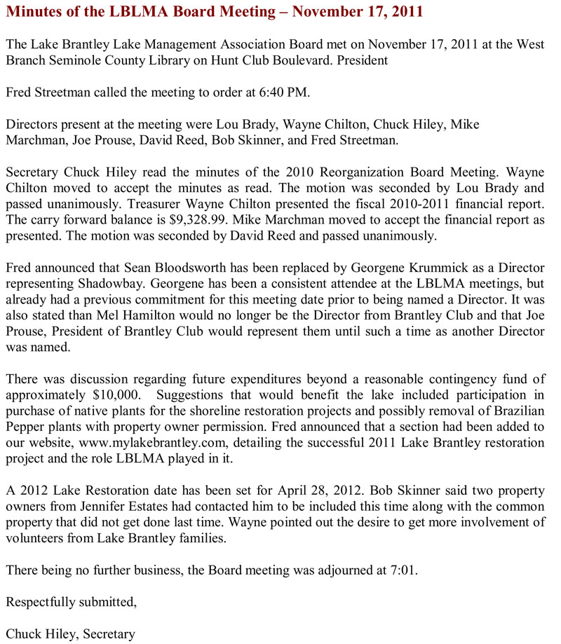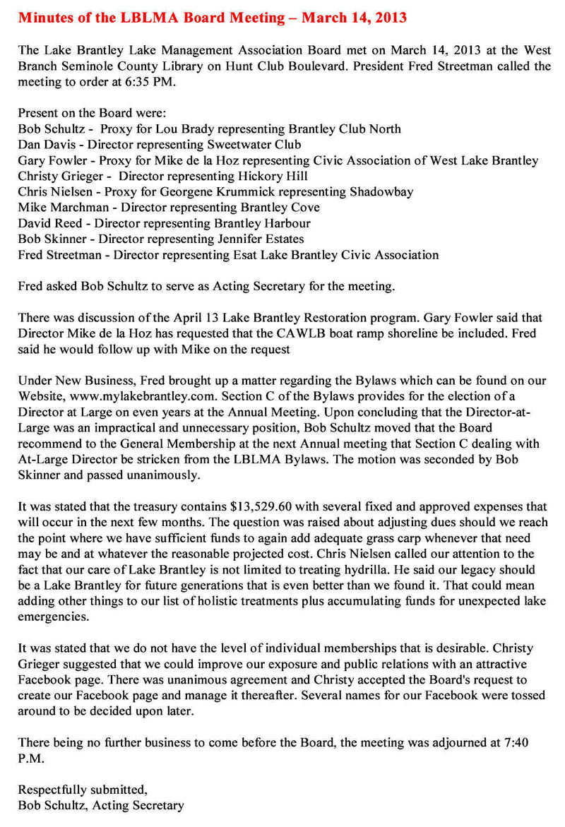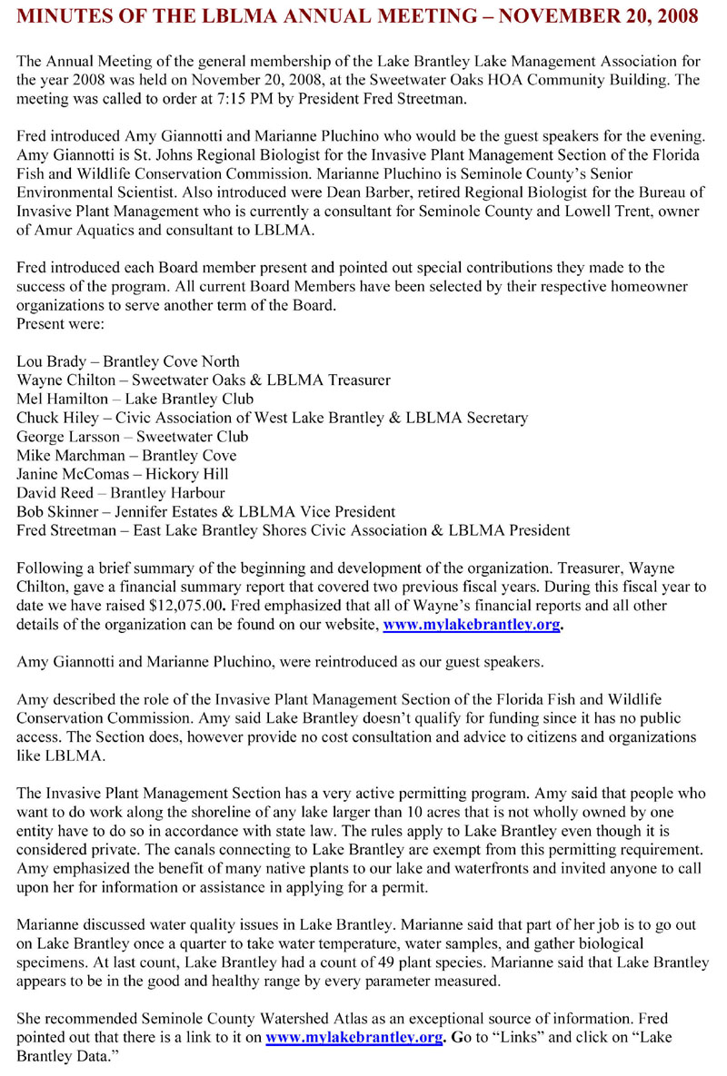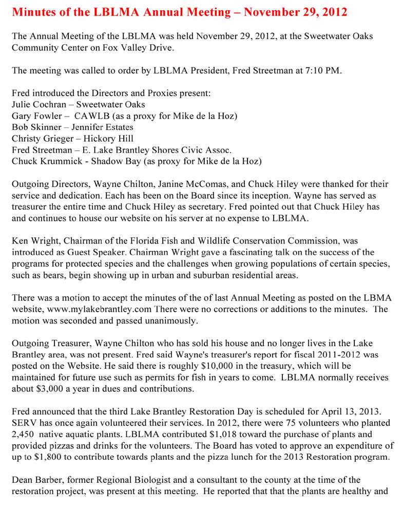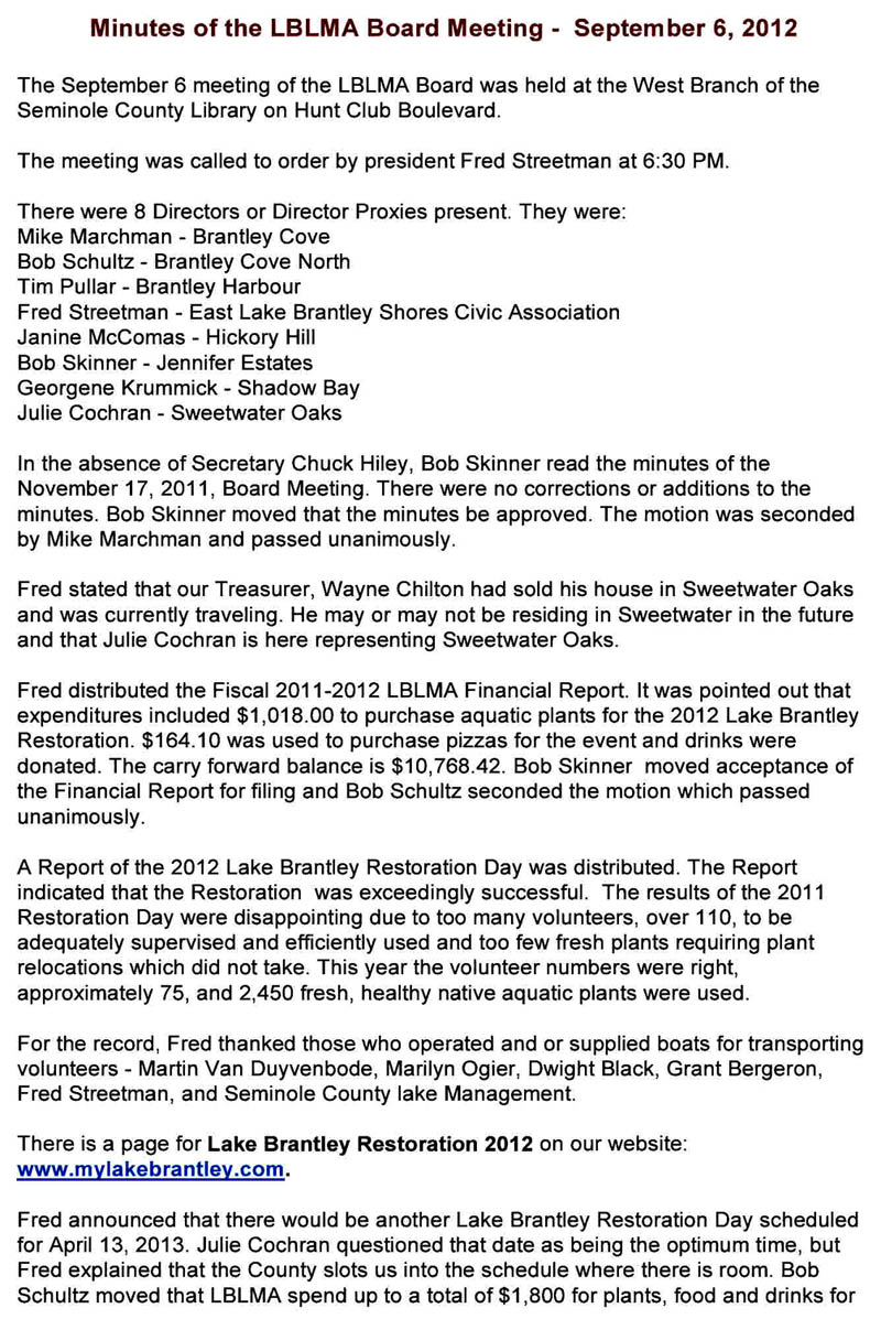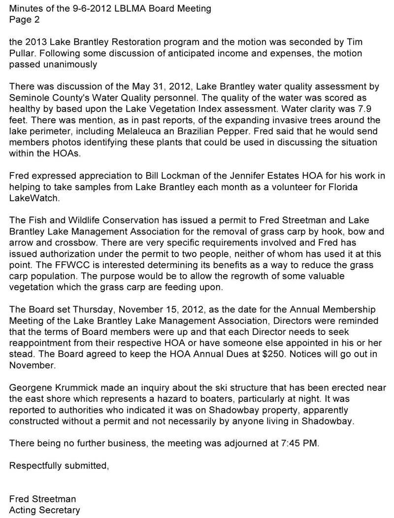 Minutes of the LBLMA Board Meeting - June 21, 2007 President Fred Streetman called this meeting of the LBLMA Board to order at 7:11 PM. Fred introduced Mike Marchman who is an original Board member, but whose wife substituted for him at the first Board meeting in October. Lou Pesce was introduced as a proxy for Janine McComas and Tim Pullar for David Reed. Fred welcomed our newest Board Member, Mel Hamilton representing Brantley Club. Also present on the Board were Fred Streetman, Bob Skinner, Chuck Hiley, Wayne Chilton, and Sean Bloodsworth. Fred recognized Dean Barber former Regional Biologist of the Florida Department of Environmental Protection and currently a consultant to Seminole County; Gloria Eby, Senior Environmental Specialist for the Seminole County Public Works Department's Road Operations/Stormwater Division; and consultant, Lowell Trent owner of Amur Aquatics. Secretary Chuck Hiley, read the minutes of the October 26, 2006 Board meeting after distributing a copy to the Board members. There were no corrections or additions to the minutes and they were unanimously approved as read. Treasurer Wayne Chilton presented the Treasure's Report after distributing copies of the report to the Board. This covered the period from 9/30/2006 to May 31, 2007. Wayne explained the fact that the report consolidated several accounts that had been used during the transition to our current corporation status. The Treasurer's report was accepted unanimously. Fred reiterated that we are now incorporated as a non profit with the State of Florida and in February applied for a 501(c)(3) designation. He said the IRS is several months behind on dealing with such applications. We now have Directors and Officers liability insurance coverage for officers and directors. He called attention to the fact that signs indicating introduction of Grass Carp into Lake Brantley are placed at every boat ramp accessing the lake. A discussion ensued regarding the loss of Grass Carp from predation due mostly to otters and mostly in canals. It was stated that 5 exclusion barriers remain in Lake Brantley and will continue to be monitored to gauge the impact of the Grass Carp. There were comments regarding the need for a previously discussed web page. Chuck and Fred will be conferring regarding its design and development with the goal of having it up and running shortly. Fred commented that a name like, "mylakebrantley.com" would be appropriate and easy to remember. There was a discussion of Lowell Trent's May 17, 2007, report of his visual survey of Lake Brantley. At this time there are 1,850 Carp remaining on our permit. Lowell's report recommended adding 1,000 to 1,800 as soon as possible. There were questions about putting fish in now in the summer heat. Lowell stated that the water was now in the low 80 degrees, which is acceptable, but that by September the temperature would be too high. Questions were raised as to what number of fish would be appropriate. The consensus was that the goal is to be aggressive without excessive removal of native plants. Wayne Chilton moved and it was seconded to stock the lake with 1,000 fish of 8-10 inches in length as soon as possible and put in the remainder later in the fall. Following some discussion, Mel Hamilton moved and it was seconded to amend the motion to state that 1,500 fish would be stocked as soon as possible and to leave 350 remaining on the permit. Bob Skinner called the question. All voted in favor of ending discussion. The amendment passed unanimously and the main motion as amended passed unanimously. Fred said that Bob Skinner would arrange to have the Carp put in at the Jennifer Estates boat ramp. Lowell was asked to get the permit amended to add 5000 fish. Julie Cochran inquired from the audience as to whether there was a "Plan B" in case the Grass Carp did not reduce the hydrilla. The response was that although combining the use of chemicals was always an option there was a high level of confidence by Lowell and others that the Grass Carp would ultimately control the hydrilla in Lake Brantley. Gloria Eby complimented the organization on its professionalism and recommended some programs for future meetings. She announced the Annual Snail Day to be held August 11 to remove Channeled Apple Snails and their eggs from Lake Brantley. She answered question about the detrimental impact of Channeled Apple Snails. There were questions about individuals using chemicals in the lake adjacent to their property. Dean Barber explained that although permits were not required in the canals of less than 10 acres, permits are required to spray in Lake Brantley. He advised individuals to contact Amy Giannatti, Regional Biologist at the Florida Department of Natural Resources. Gloria Eby and Dean Barber referred us to individuals involved with Myrtle Lake to learn about their experience in obtaining a 501(C)(3) designation. There being no further business, the meeting was adjourned at 8:30 PM. Respectfully submitted, Chuck Hiley, Secretary October 26, 2006 Meeting The first Board meeting for the new Lake Brantley lake-wide association was held on October 26, 2006. There were approximately a dozen attending the meeting in addition to the Board members. Fred Streetman, acting as temporary moderator, called this meeting to order, at 7:00 P.M. October 26, 2006. Fred welcomed everyone, and asked each Board member to introduce himself or herself. Present were: Bloodsworth, Sean – Isles of Shadowbay Brady, Lou – Brantley Cove North Chilton, Wayne – Sweetwater Oaks Hiley, Chuck – Civic Association of West Lake Brantley Larsson, George – Sweetwater Club Marchman, Shirley – Brantley Cove (Proxy for Board Member Mike Marchman) McComas, Janine – Hickory Hill Reed, David – Brantley Harbour Skinner, Bob – Jennifer Estates Streetman, Fred – East Lake Brantley Shores Civic Association Prouse, Joe – Brantley Club was absent It was announced that as of the moment contributions to 