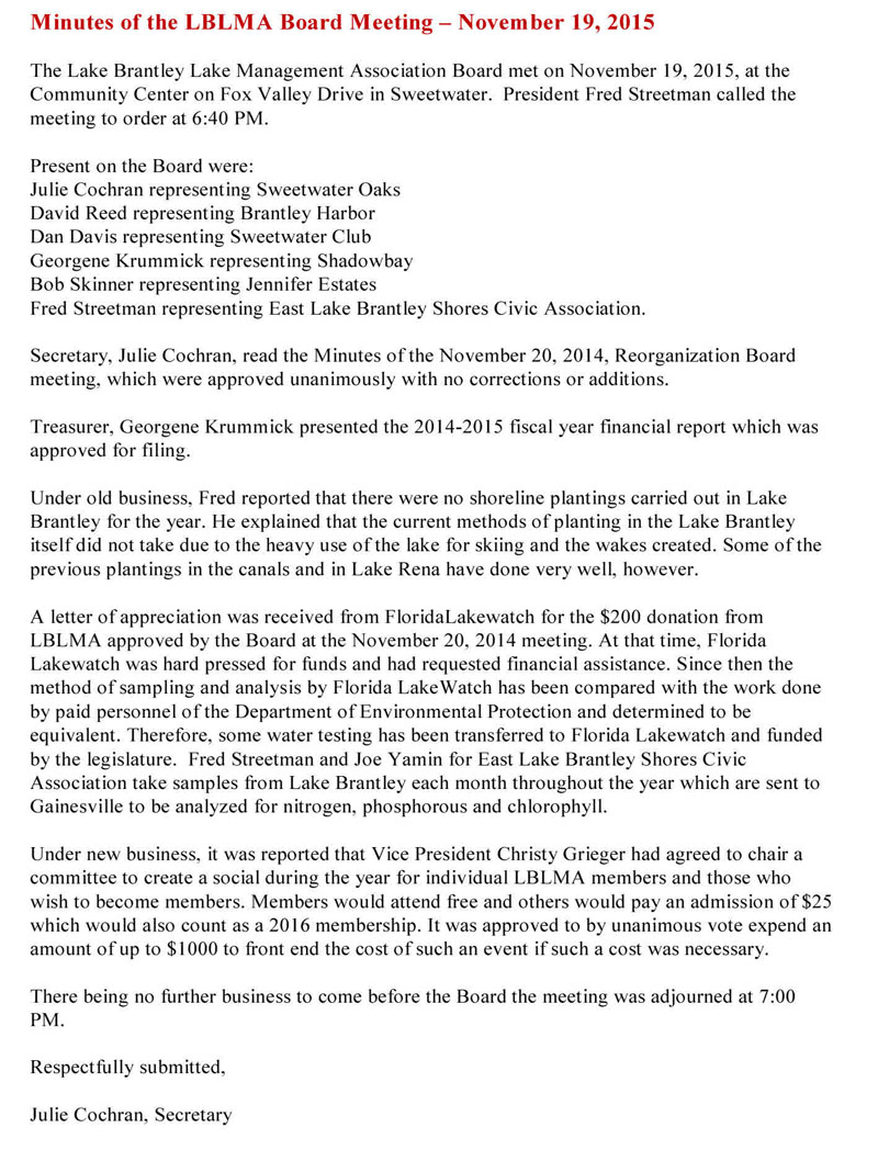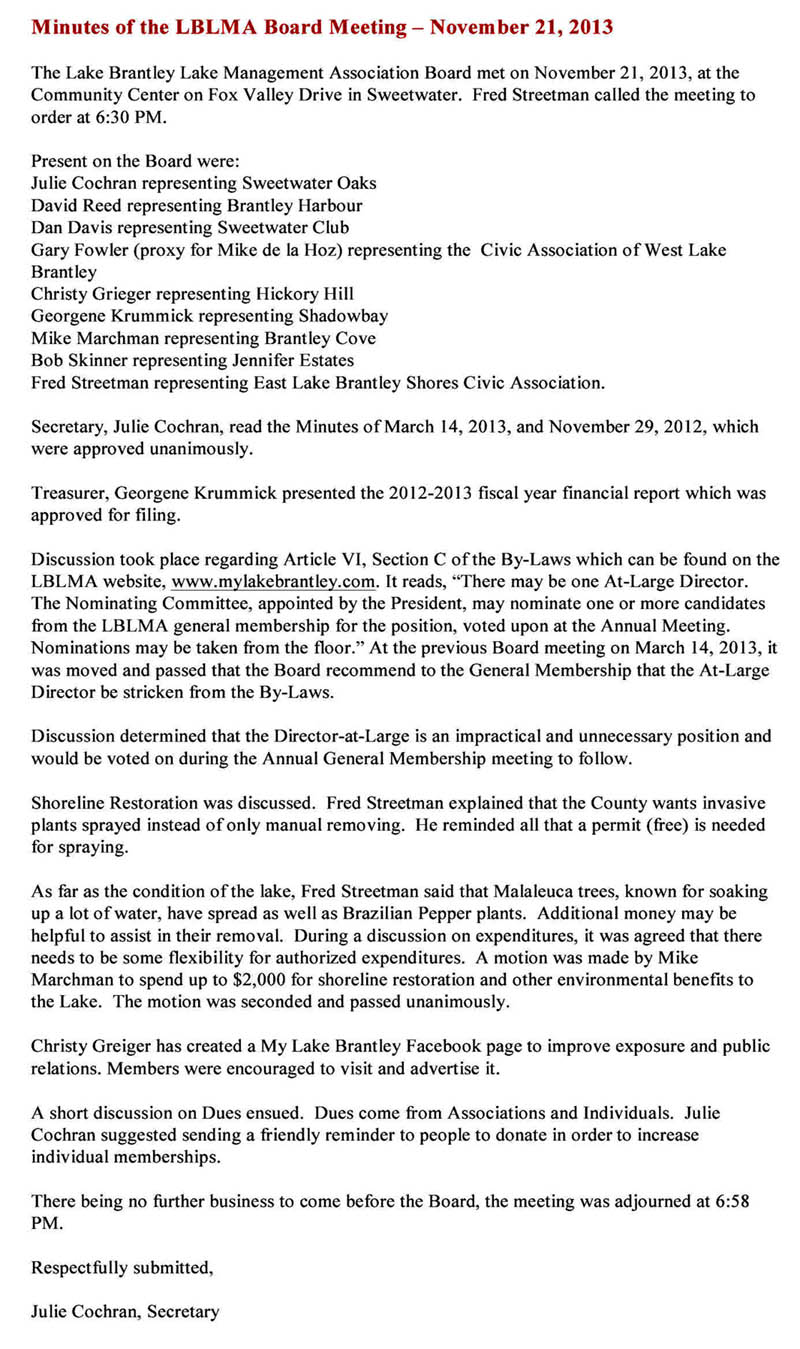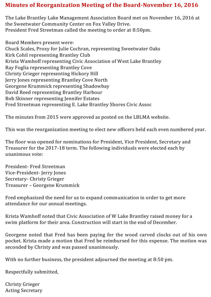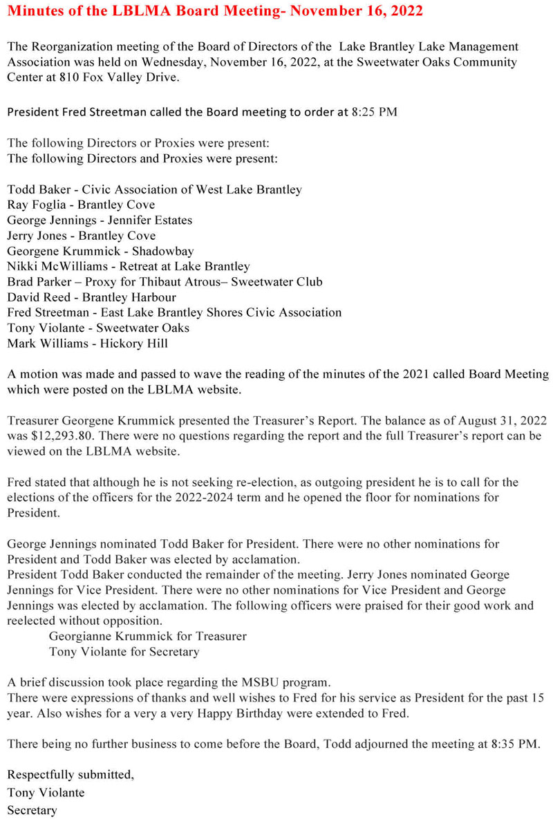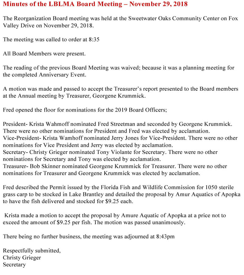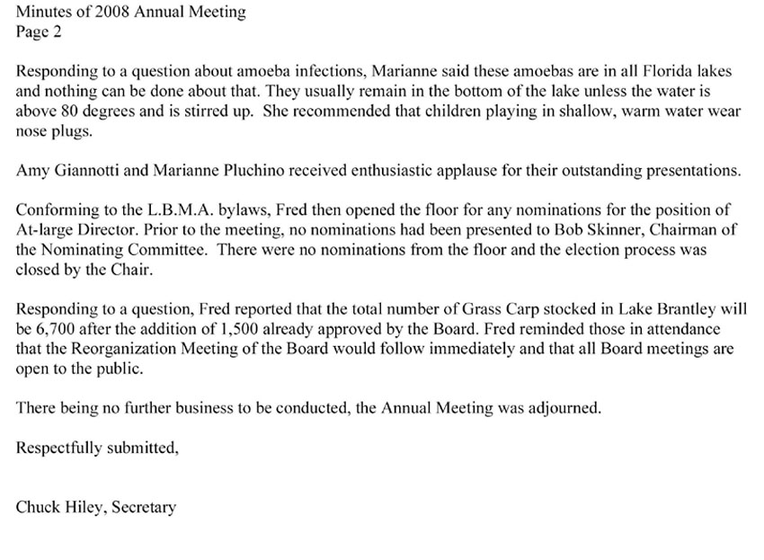 Minutes of the LBLMA Board Meeting - June 21, 2007 President Fred Streetman called this meeting of the LBLMA Board to order at 7:11 PM. Fred introduced Mike Marchman who is an original Board member, but whose wife substituted for him at the first Board meeting in October. Lou Pesce was introduced as a proxy for Janine McComas and Tim Pullar for David Reed. Fred welcomed our newest Board Member, Mel Hamilton representing Brantley Club. Also present on the Board were Fred Streetman, Bob Skinner, Chuck Hiley, Wayne Chilton, and Sean Bloodsworth. Fred recognized Dean Barber former Regional Biologist of the Florida Department of Environmental Protection and currently a consultant to Seminole County; Gloria Eby, Senior Environmental Specialist for the Seminole County Public Works Department's Road Operations/Stormwater Division; and consultant, Lowell Trent owner of Amur Aquatics. Secretary Chuck Hiley, read the minutes of the October 26, 2006 Board meeting after distributing a copy to the Board members. There were no corrections or additions to the minutes and they were unanimously approved as read. Treasurer Wayne Chilton presented the Treasure's Report after distributing copies of the report to the Board. This covered the period from 9/30/2006 to May 31, 2007. Wayne explained the fact that the report consolidated several accounts that had been used during the transition to our current corporation status. The Treasurer's report was accepted unanimously. Fred reiterated that we are now incorporated as a non profit with the State of Florida and in February applied for a 501(c)(3) designation. He said the IRS is several months behind on dealing with such applications. We now have Directors and Officers liability insurance coverage for officers and directors. He called attention to the fact that signs indicating introduction of Grass Carp into Lake Brantley are placed at every boat ramp accessing the lake. A discussion ensued regarding the loss of Grass Carp from predation due mostly to otters and mostly in canals. It was stated that 5 exclusion barriers remain in Lake Brantley and will continue to be monitored to gauge the impact of the Grass Carp. There were comments regarding the need for a previously discussed web page. Chuck and Fred will be conferring regarding its design and development with the goal of having it up and running shortly. Fred commented that a name like, "mylakebrantley.com" would be appropriate and easy to remember. There was a discussion of Lowell Trent's May 17, 2007, report of his visual survey of Lake Brantley. At this time there are 1,850 Carp remaining on our permit. Lowell's report recommended adding 1,000 to 1,800 as soon as possible. There were questions about putting fish in now in the summer heat. Lowell stated that the water was now in the low 80 degrees, which is acceptable, but that by September the temperature would be too high. Questions were raised as to what number of fish would be appropriate. The consensus was that the goal is to be aggressive without excessive removal of native plants. Wayne Chilton moved and it was seconded to stock the lake with 1,000 fish of 8-10 inches in length as soon as possible and put in the remainder later in the fall. Following some discussion, Mel Hamilton moved and it was seconded to amend the motion to state that 1,500 fish would be stocked as soon as possible and to leave 350 remaining on the permit. Bob Skinner called the question. All voted in favor of ending discussion. The amendment passed unanimously and the main motion as amended passed unanimously. Fred said that Bob Skinner would arrange to have the Carp put in at the Jennifer Estates boat ramp. Lowell was asked to get the permit amended to add 5000 fish. Julie Cochran inquired from the audience as to whether there was a "Plan B" in case the Grass Carp did not reduce the hydrilla. The response was that although combining the use of chemicals was always an option there was a high level of confidence by Lowell and others that the Grass Carp would ultimately control the hydrilla in Lake Brantley. Gloria Eby complimented the organization on its professionalism and recommended some programs for future meetings. She announced the Annual Snail Day to be held August 11 to remove Channeled Apple Snails and their eggs from Lake Brantley. She answered question about the detrimental impact of Channeled Apple Snails. There were questions about individuals using chemicals in the lake adjacent to their property. Dean Barber explained that although permits were not required in the canals of less than 10 acres, permits are required to spray in Lake Brantley. He advised individuals to contact Amy Giannatti, Regional Biologist at the Florida Department of Natural Resources. Gloria Eby and Dean Barber referred us to individuals involved with Myrtle Lake to learn about their experience in obtaining a 501(C)(3) designation. There being no further business, the meeting was adjourned at 8:30 PM. Respectfully submitted, Chuck Hiley, Secretary October 26, 2006 Meeting The first Board meeting for the new Lake Brantley lake-wide association was held on October 26, 2006. There were approximately a dozen attending the meeting in addition to the Board members. Fred Streetman, acting as temporary moderator, called this meeting to order, at 7:00 P.M. October 26, 2006. Fred welcomed everyone, and asked each Board member to introduce himself or herself. Present were: Bloodsworth, Sean – Isles of Shadowbay Brady, Lou – Brantley Cove North Chilton, Wayne – Sweetwater Oaks Hiley, Chuck – Civic Association of West Lake Brantley Larsson, George – Sweetwater Club Marchman, Shirley – Brantley Cove (Proxy for Board Member Mike Marchman) McComas, Janine – Hickory Hill Reed, David – Brantley Harbour Skinner, Bob – Jennifer Estates Streetman, Fred – East Lake Brantley Shores Civic Association Prouse, Joe – Brantley Club was absent It was announced that as of the moment contributions to 