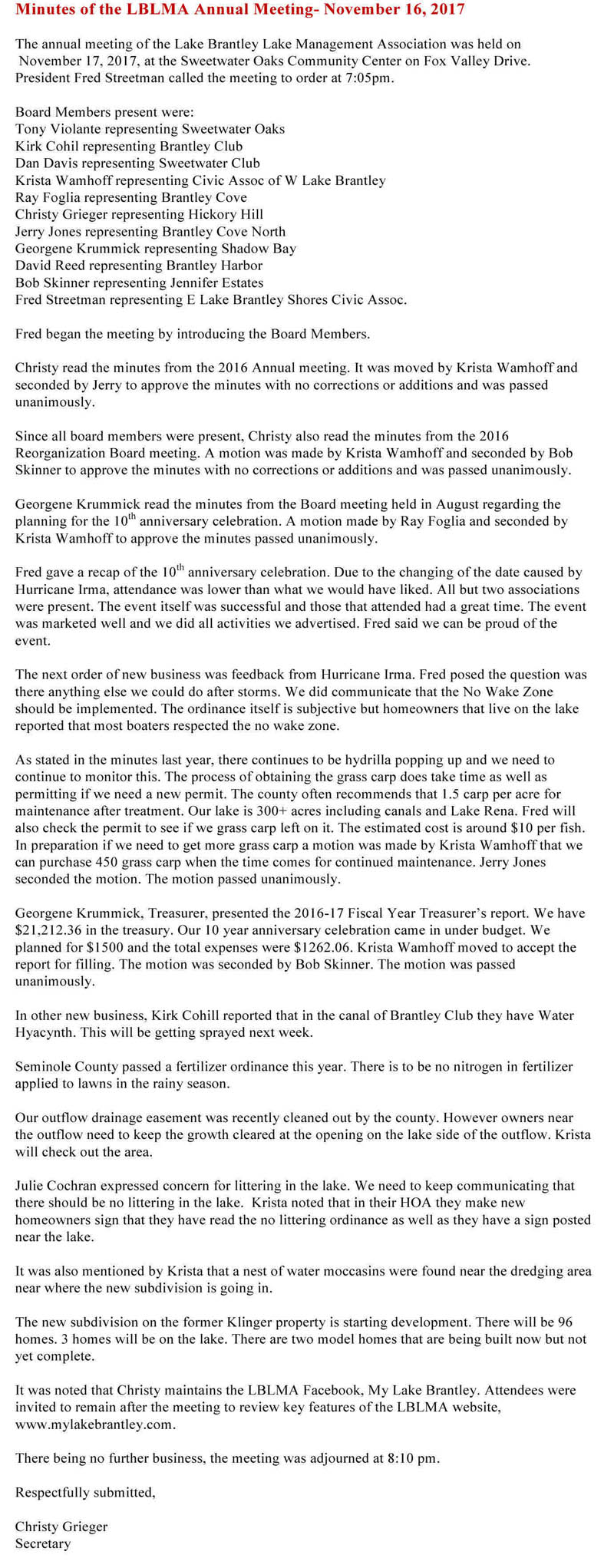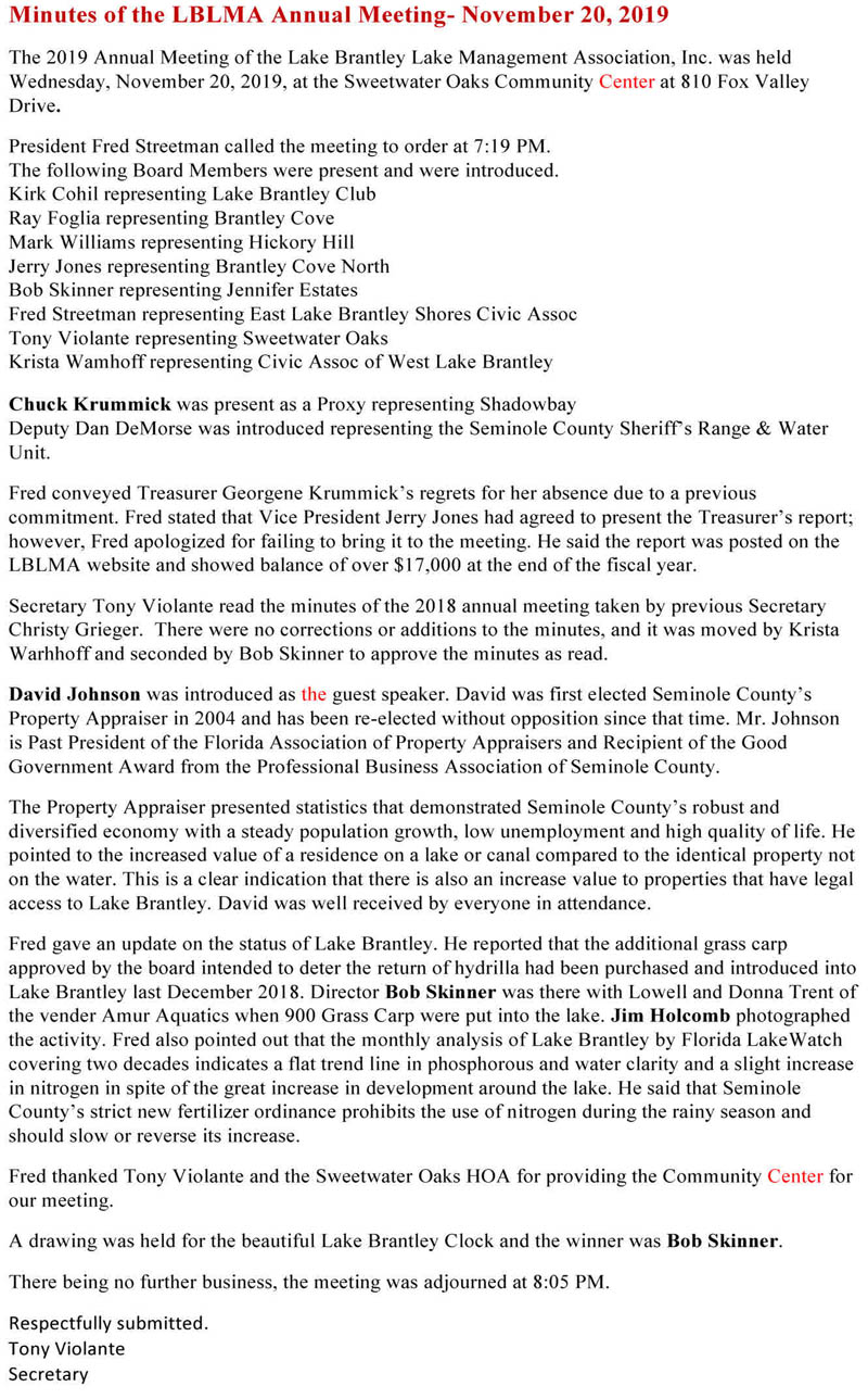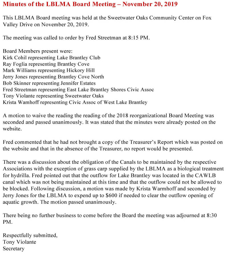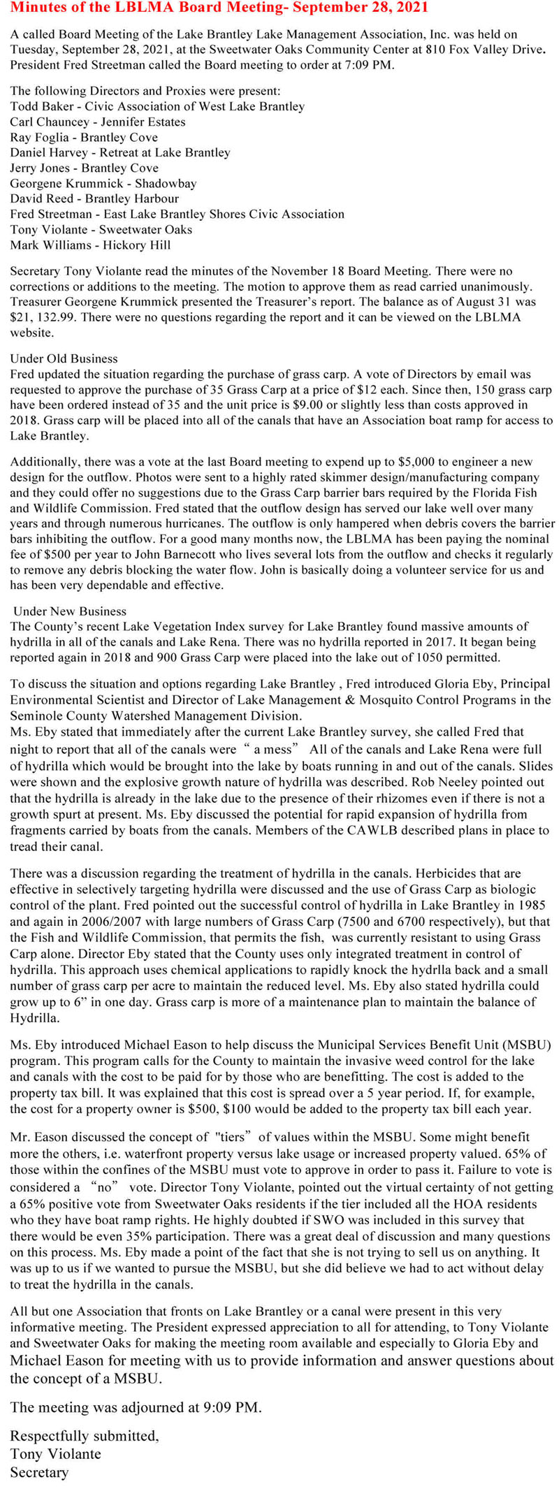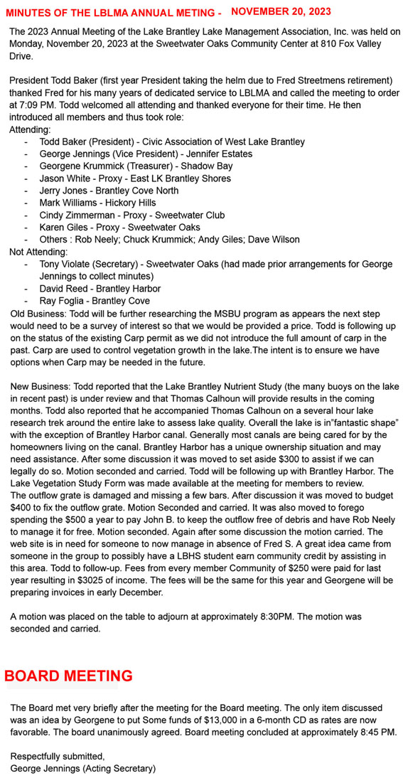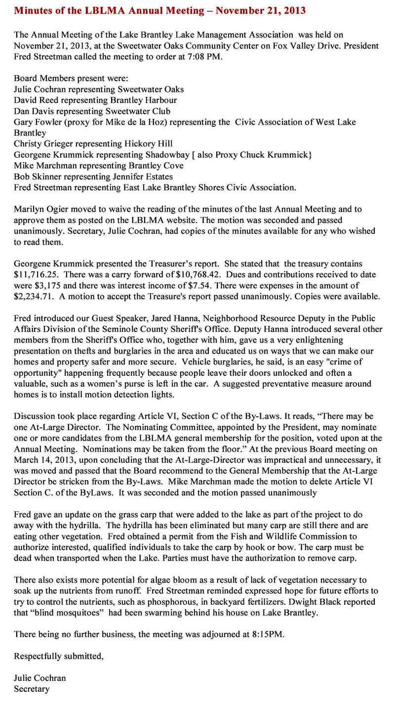 Minutes of the LBLMA Board Meeting - June 21, 2007 President Fred Streetman called this meeting of the LBLMA Board to order at 7:11 PM. Fred introduced Mike Marchman who is an original Board member, but whose wife substituted for him at the first Board meeting in October. Lou Pesce was introduced as a proxy for Janine McComas and Tim Pullar for David Reed. Fred welcomed our newest Board Member, Mel Hamilton representing Brantley Club. Also present on the Board were Fred Streetman, Bob Skinner, Chuck Hiley, Wayne Chilton, and Sean Bloodsworth. Fred recognized Dean Barber former Regional Biologist of the Florida Department of Environmental Protection and currently a consultant to Seminole County; Gloria Eby, Senior Environmental Specialist for the Seminole County Public Works Department's Road Operations/Stormwater Division; and consultant, Lowell Trent owner of Amur Aquatics. Secretary Chuck Hiley, read the minutes of the October 26, 2006 Board meeting after distributing a copy to the Board members. There were no corrections or additions to the minutes and they were unanimously approved as read. Treasurer Wayne Chilton presented the Treasure's Report after distributing copies of the report to the Board. This covered the period from 9/30/2006 to May 31, 2007. Wayne explained the fact that the report consolidated several accounts that had been used during the transition to our current corporation status. The Treasurer's report was accepted unanimously. Fred reiterated that we are now incorporated as a non profit with the State of Florida and in February applied for a 501(c)(3) designation. He said the IRS is several months behind on dealing with such applications. We now have Directors and Officers liability insurance coverage for officers and directors. He called attention to the fact that signs indicating introduction of Grass Carp into Lake Brantley are placed at every boat ramp accessing the lake. A discussion ensued regarding the loss of Grass Carp from predation due mostly to otters and mostly in canals. It was stated that 5 exclusion barriers remain in Lake Brantley and will continue to be monitored to gauge the impact of the Grass Carp. There were comments regarding the need for a previously discussed web page. Chuck and Fred will be conferring regarding its design and development with the goal of having it up and running shortly. Fred commented that a name like, "mylakebrantley.com" would be appropriate and easy to remember. There was a discussion of Lowell Trent's May 17, 2007, report of his visual survey of Lake Brantley. At this time there are 1,850 Carp remaining on our permit. Lowell's report recommended adding 1,000 to 1,800 as soon as possible. There were questions about putting fish in now in the summer heat. Lowell stated that the water was now in the low 80 degrees, which is acceptable, but that by September the temperature would be too high. Questions were raised as to what number of fish would be appropriate. The consensus was that the goal is to be aggressive without excessive removal of native plants. Wayne Chilton moved and it was seconded to stock the lake with 1,000 fish of 8-10 inches in length as soon as possible and put in the remainder later in the fall. Following some discussion, Mel Hamilton moved and it was seconded to amend the motion to state that 1,500 fish would be stocked as soon as possible and to leave 350 remaining on the permit. Bob Skinner called the question. All voted in favor of ending discussion. The amendment passed unanimously and the main motion as amended passed unanimously. Fred said that Bob Skinner would arrange to have the Carp put in at the Jennifer Estates boat ramp. Lowell was asked to get the permit amended to add 5000 fish. Julie Cochran inquired from the audience as to whether there was a "Plan B" in case the Grass Carp did not reduce the hydrilla. The response was that although combining the use of chemicals was always an option there was a high level of confidence by Lowell and others that the Grass Carp would ultimately control the hydrilla in Lake Brantley. Gloria Eby complimented the organization on its professionalism and recommended some programs for future meetings. She announced the Annual Snail Day to be held August 11 to remove Channeled Apple Snails and their eggs from Lake Brantley. She answered question about the detrimental impact of Channeled Apple Snails. There were questions about individuals using chemicals in the lake adjacent to their property. Dean Barber explained that although permits were not required in the canals of less than 10 acres, permits are required to spray in Lake Brantley. He advised individuals to contact Amy Giannatti, Regional Biologist at the Florida Department of Natural Resources. Gloria Eby and Dean Barber referred us to individuals involved with Myrtle Lake to learn about their experience in obtaining a 501(C)(3) designation. There being no further business, the meeting was adjourned at 8:30 PM. Respectfully submitted, Chuck Hiley, Secretary October 26, 2006 Meeting The first Board meeting for the new Lake Brantley lake-wide association was held on October 26, 2006. There were approximately a dozen attending the meeting in addition to the Board members. Fred Streetman, acting as temporary moderator, called this meeting to order, at 7:00 P.M. October 26, 2006. Fred welcomed everyone, and asked each Board member to introduce himself or herself. Present were: Bloodsworth, Sean – Isles of Shadowbay Brady, Lou – Brantley Cove North Chilton, Wayne – Sweetwater Oaks Hiley, Chuck – Civic Association of West Lake Brantley Larsson, George – Sweetwater Club Marchman, Shirley – Brantley Cove (Proxy for Board Member Mike Marchman) McComas, Janine – Hickory Hill Reed, David – Brantley Harbour Skinner, Bob – Jennifer Estates Streetman, Fred – East Lake Brantley Shores Civic Association Prouse, Joe – Brantley Club was absent It was announced that as of the moment contributions to 
