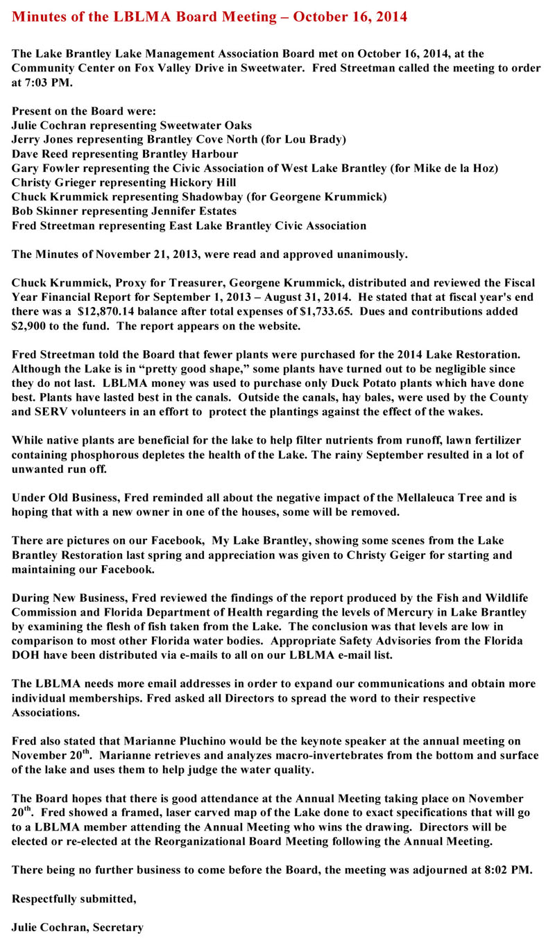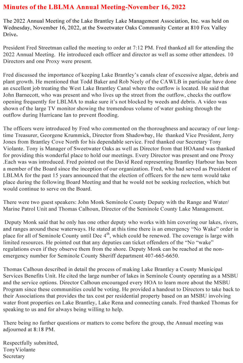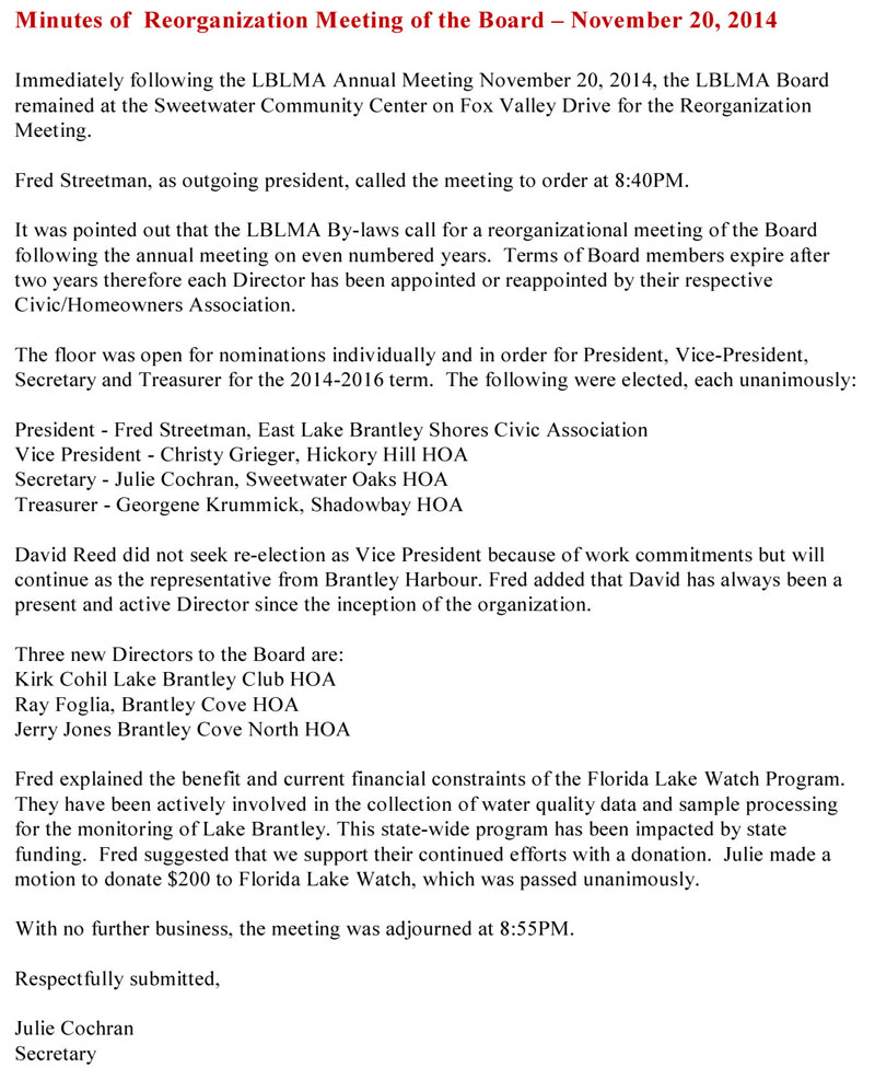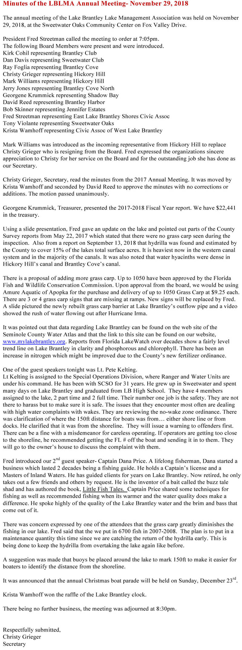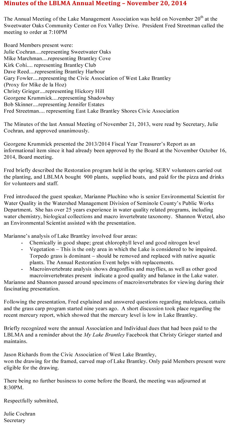 Minutes of the LBLMA Board Meeting - June 21, 2007 President Fred Streetman called this meeting of the LBLMA Board to order at 7:11 PM. Fred introduced Mike Marchman who is an original Board member, but whose wife substituted for him at the first Board meeting in October. Lou Pesce was introduced as a proxy for Janine McComas and Tim Pullar for David Reed. Fred welcomed our newest Board Member, Mel Hamilton representing Brantley Club. Also present on the Board were Fred Streetman, Bob Skinner, Chuck Hiley, Wayne Chilton, and Sean Bloodsworth. Fred recognized Dean Barber former Regional Biologist of the Florida Department of Environmental Protection and currently a consultant to Seminole County; Gloria Eby, Senior Environmental Specialist for the Seminole County Public Works Department's Road Operations/Stormwater Division; and consultant, Lowell Trent owner of Amur Aquatics. Secretary Chuck Hiley, read the minutes of the October 26, 2006 Board meeting after distributing a copy to the Board members. There were no corrections or additions to the minutes and they were unanimously approved as read. Treasurer Wayne Chilton presented the Treasure's Report after distributing copies of the report to the Board. This covered the period from 9/30/2006 to May 31, 2007. Wayne explained the fact that the report consolidated several accounts that had been used during the transition to our current corporation status. The Treasurer's report was accepted unanimously. Fred reiterated that we are now incorporated as a non profit with the State of Florida and in February applied for a 501(c)(3) designation. He said the IRS is several months behind on dealing with such applications. We now have Directors and Officers liability insurance coverage for officers and directors. He called attention to the fact that signs indicating introduction of Grass Carp into Lake Brantley are placed at every boat ramp accessing the lake. A discussion ensued regarding the loss of Grass Carp from predation due mostly to otters and mostly in canals. It was stated that 5 exclusion barriers remain in Lake Brantley and will continue to be monitored to gauge the impact of the Grass Carp. There were comments regarding the need for a previously discussed web page. Chuck and Fred will be conferring regarding its design and development with the goal of having it up and running shortly. Fred commented that a name like, "mylakebrantley.com" would be appropriate and easy to remember. There was a discussion of Lowell Trent's May 17, 2007, report of his visual survey of Lake Brantley. At this time there are 1,850 Carp remaining on our permit. Lowell's report recommended adding 1,000 to 1,800 as soon as possible. There were questions about putting fish in now in the summer heat. Lowell stated that the water was now in the low 80 degrees, which is acceptable, but that by September the temperature would be too high. Questions were raised as to what number of fish would be appropriate. The consensus was that the goal is to be aggressive without excessive removal of native plants. Wayne Chilton moved and it was seconded to stock the lake with 1,000 fish of 8-10 inches in length as soon as possible and put in the remainder later in the fall. Following some discussion, Mel Hamilton moved and it was seconded to amend the motion to state that 1,500 fish would be stocked as soon as possible and to leave 350 remaining on the permit. Bob Skinner called the question. All voted in favor of ending discussion. The amendment passed unanimously and the main motion as amended passed unanimously. Fred said that Bob Skinner would arrange to have the Carp put in at the Jennifer Estates boat ramp. Lowell was asked to get the permit amended to add 5000 fish. Julie Cochran inquired from the audience as to whether there was a "Plan B" in case the Grass Carp did not reduce the hydrilla. The response was that although combining the use of chemicals was always an option there was a high level of confidence by Lowell and others that the Grass Carp would ultimately control the hydrilla in Lake Brantley. Gloria Eby complimented the organization on its professionalism and recommended some programs for future meetings. She announced the Annual Snail Day to be held August 11 to remove Channeled Apple Snails and their eggs from Lake Brantley. She answered question about the detrimental impact of Channeled Apple Snails. There were questions about individuals using chemicals in the lake adjacent to their property. Dean Barber explained that although permits were not required in the canals of less than 10 acres, permits are required to spray in Lake Brantley. He advised individuals to contact Amy Giannatti, Regional Biologist at the Florida Department of Natural Resources. Gloria Eby and Dean Barber referred us to individuals involved with Myrtle Lake to learn about their experience in obtaining a 501(C)(3) designation. There being no further business, the meeting was adjourned at 8:30 PM. Respectfully submitted, Chuck Hiley, Secretary October 26, 2006 Meeting The first Board meeting for the new Lake Brantley lake-wide association was held on October 26, 2006. There were approximately a dozen attending the meeting in addition to the Board members. Fred Streetman, acting as temporary moderator, called this meeting to order, at 7:00 P.M. October 26, 2006. Fred welcomed everyone, and asked each Board member to introduce himself or herself. Present were: Bloodsworth, Sean – Isles of Shadowbay Brady, Lou – Brantley Cove North Chilton, Wayne – Sweetwater Oaks Hiley, Chuck – Civic Association of West Lake Brantley Larsson, George – Sweetwater Club Marchman, Shirley – Brantley Cove (Proxy for Board Member Mike Marchman) McComas, Janine – Hickory Hill Reed, David – Brantley Harbour Skinner, Bob – Jennifer Estates Streetman, Fred – East Lake Brantley Shores Civic Association Prouse, Joe – Brantley Club was absent It was announced that as of the moment contributions to 