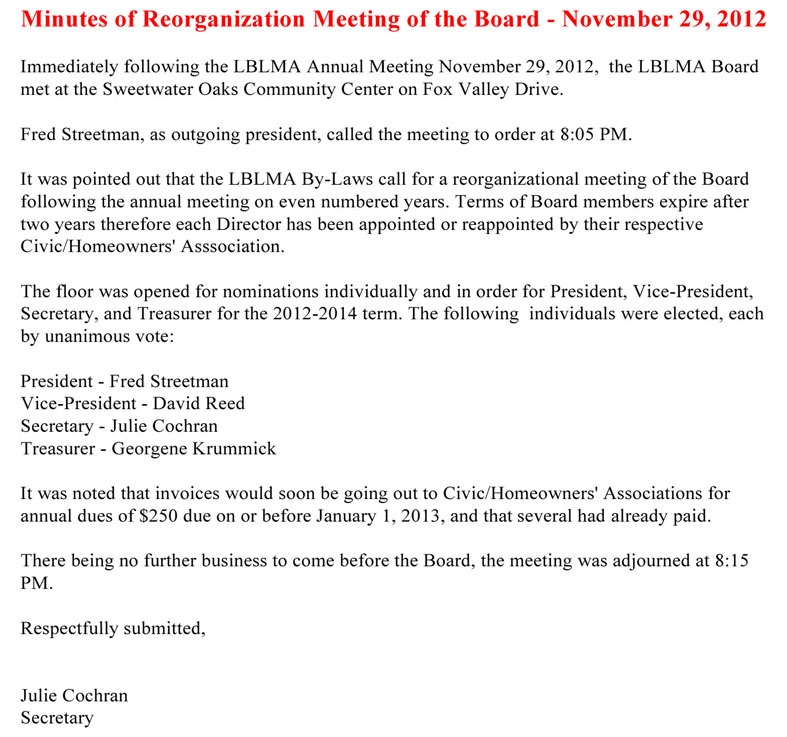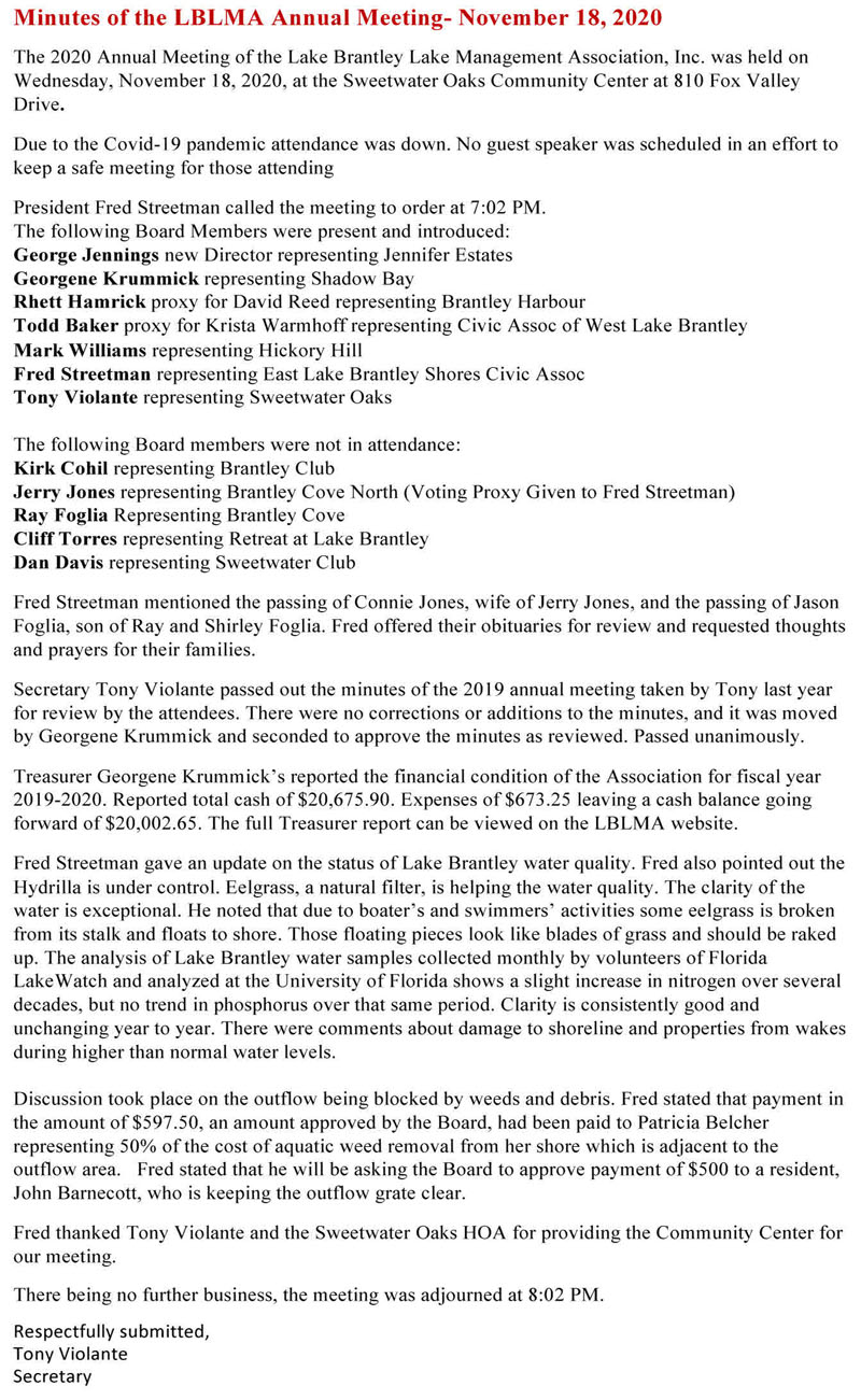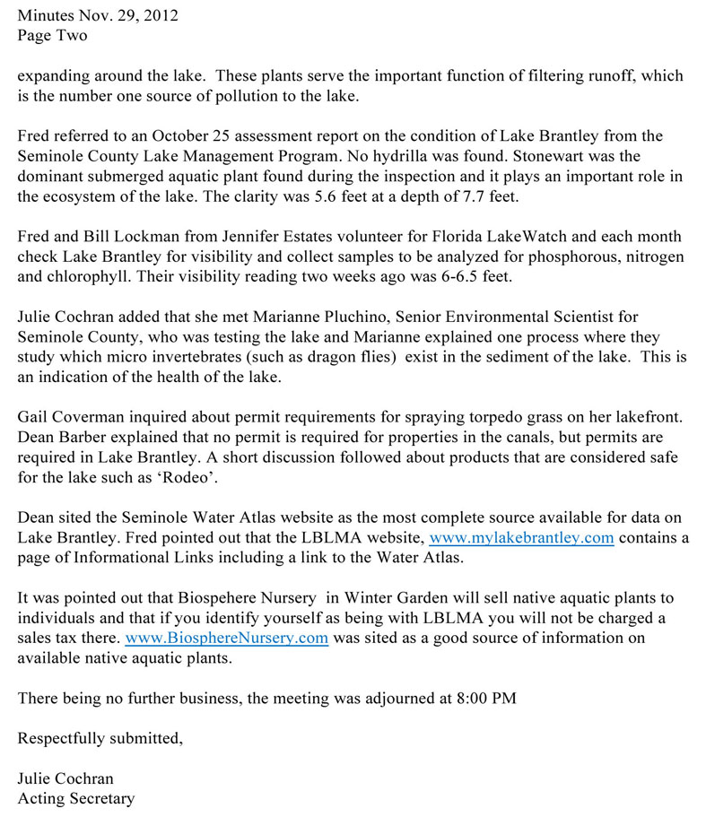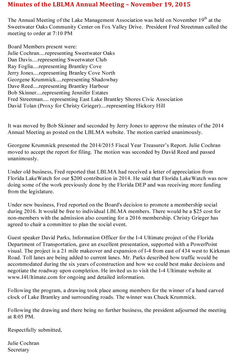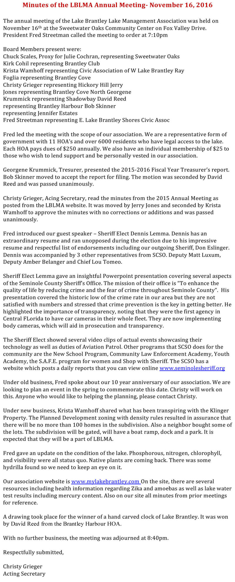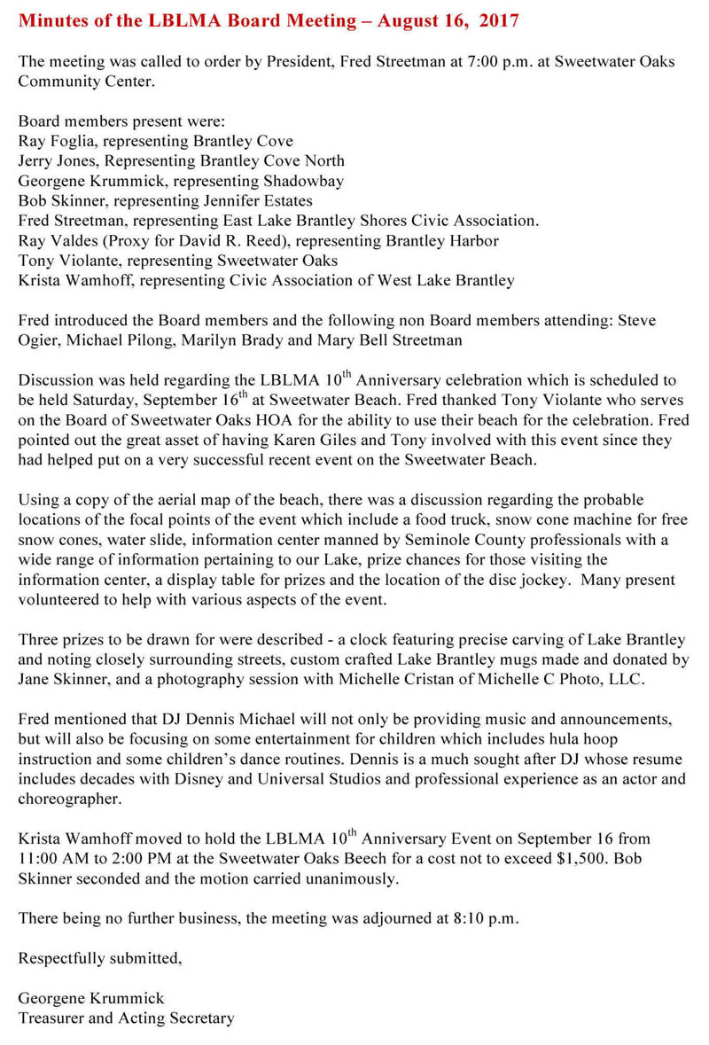 Minutes of the LBLMA Board Meeting - June 21, 2007 President Fred Streetman called this meeting of the LBLMA Board to order at 7:11 PM. Fred introduced Mike Marchman who is an original Board member, but whose wife substituted for him at the first Board meeting in October. Lou Pesce was introduced as a proxy for Janine McComas and Tim Pullar for David Reed. Fred welcomed our newest Board Member, Mel Hamilton representing Brantley Club. Also present on the Board were Fred Streetman, Bob Skinner, Chuck Hiley, Wayne Chilton, and Sean Bloodsworth. Fred recognized Dean Barber former Regional Biologist of the Florida Department of Environmental Protection and currently a consultant to Seminole County; Gloria Eby, Senior Environmental Specialist for the Seminole County Public Works Department's Road Operations/Stormwater Division; and consultant, Lowell Trent owner of Amur Aquatics. Secretary Chuck Hiley, read the minutes of the October 26, 2006 Board meeting after distributing a copy to the Board members. There were no corrections or additions to the minutes and they were unanimously approved as read. Treasurer Wayne Chilton presented the Treasure's Report after distributing copies of the report to the Board. This covered the period from 9/30/2006 to May 31, 2007. Wayne explained the fact that the report consolidated several accounts that had been used during the transition to our current corporation status. The Treasurer's report was accepted unanimously. Fred reiterated that we are now incorporated as a non profit with the State of Florida and in February applied for a 501(c)(3) designation. He said the IRS is several months behind on dealing with such applications. We now have Directors and Officers liability insurance coverage for officers and directors. He called attention to the fact that signs indicating introduction of Grass Carp into Lake Brantley are placed at every boat ramp accessing the lake. A discussion ensued regarding the loss of Grass Carp from predation due mostly to otters and mostly in canals. It was stated that 5 exclusion barriers remain in Lake Brantley and will continue to be monitored to gauge the impact of the Grass Carp. There were comments regarding the need for a previously discussed web page. Chuck and Fred will be conferring regarding its design and development with the goal of having it up and running shortly. Fred commented that a name like, "mylakebrantley.com" would be appropriate and easy to remember. There was a discussion of Lowell Trent's May 17, 2007, report of his visual survey of Lake Brantley. At this time there are 1,850 Carp remaining on our permit. Lowell's report recommended adding 1,000 to 1,800 as soon as possible. There were questions about putting fish in now in the summer heat. Lowell stated that the water was now in the low 80 degrees, which is acceptable, but that by September the temperature would be too high. Questions were raised as to what number of fish would be appropriate. The consensus was that the goal is to be aggressive without excessive removal of native plants. Wayne Chilton moved and it was seconded to stock the lake with 1,000 fish of 8-10 inches in length as soon as possible and put in the remainder later in the fall. Following some discussion, Mel Hamilton moved and it was seconded to amend the motion to state that 1,500 fish would be stocked as soon as possible and to leave 350 remaining on the permit. Bob Skinner called the question. All voted in favor of ending discussion. The amendment passed unanimously and the main motion as amended passed unanimously. Fred said that Bob Skinner would arrange to have the Carp put in at the Jennifer Estates boat ramp. Lowell was asked to get the permit amended to add 5000 fish. Julie Cochran inquired from the audience as to whether there was a "Plan B" in case the Grass Carp did not reduce the hydrilla. The response was that although combining the use of chemicals was always an option there was a high level of confidence by Lowell and others that the Grass Carp would ultimately control the hydrilla in Lake Brantley. Gloria Eby complimented the organization on its professionalism and recommended some programs for future meetings. She announced the Annual Snail Day to be held August 11 to remove Channeled Apple Snails and their eggs from Lake Brantley. She answered question about the detrimental impact of Channeled Apple Snails. There were questions about individuals using chemicals in the lake adjacent to their property. Dean Barber explained that although permits were not required in the canals of less than 10 acres, permits are required to spray in Lake Brantley. He advised individuals to contact Amy Giannatti, Regional Biologist at the Florida Department of Natural Resources. Gloria Eby and Dean Barber referred us to individuals involved with Myrtle Lake to learn about their experience in obtaining a 501(C)(3) designation. There being no further business, the meeting was adjourned at 8:30 PM. Respectfully submitted, Chuck Hiley, Secretary October 26, 2006 Meeting The first Board meeting for the new Lake Brantley lake-wide association was held on October 26, 2006. There were approximately a dozen attending the meeting in addition to the Board members. Fred Streetman, acting as temporary moderator, called this meeting to order, at 7:00 P.M. October 26, 2006. Fred welcomed everyone, and asked each Board member to introduce himself or herself. Present were: Bloodsworth, Sean – Isles of Shadowbay Brady, Lou – Brantley Cove North Chilton, Wayne – Sweetwater Oaks Hiley, Chuck – Civic Association of West Lake Brantley Larsson, George – Sweetwater Club Marchman, Shirley – Brantley Cove (Proxy for Board Member Mike Marchman) McComas, Janine – Hickory Hill Reed, David – Brantley Harbour Skinner, Bob – Jennifer Estates Streetman, Fred – East Lake Brantley Shores Civic Association Prouse, Joe – Brantley Club was absent It was announced that as of the moment contributions to 